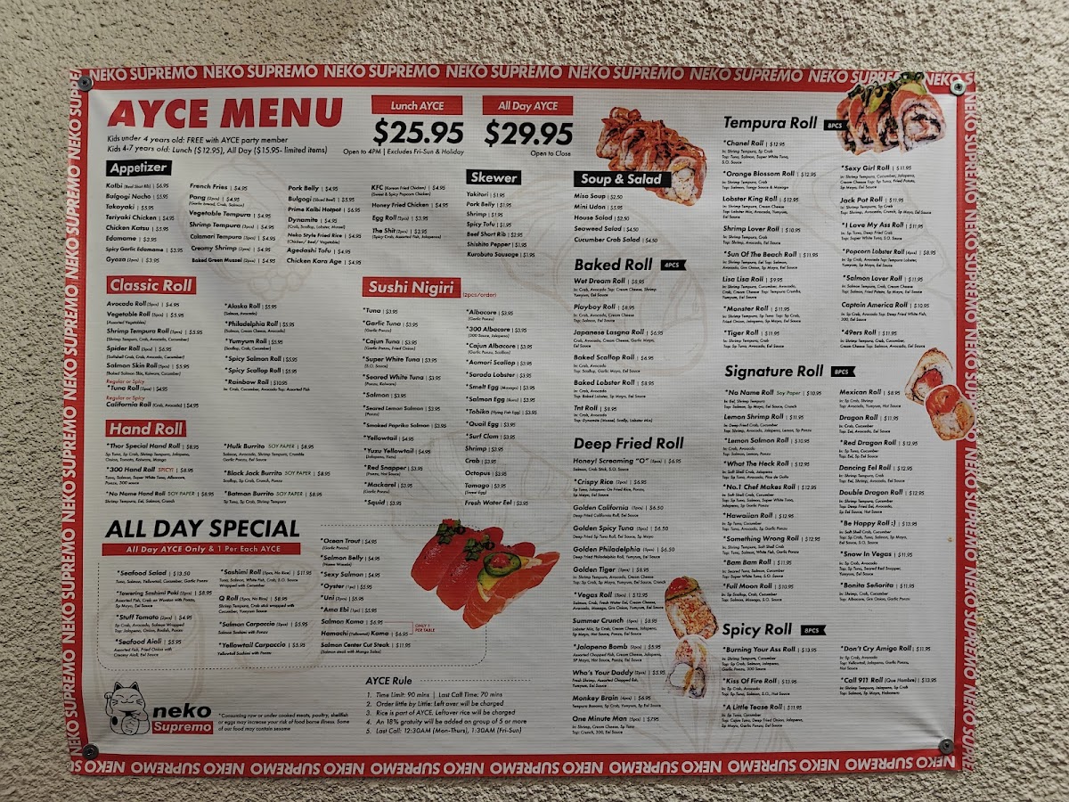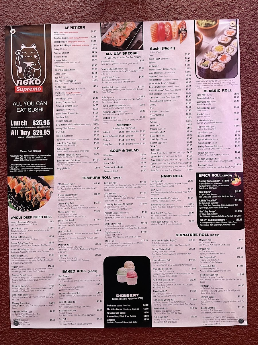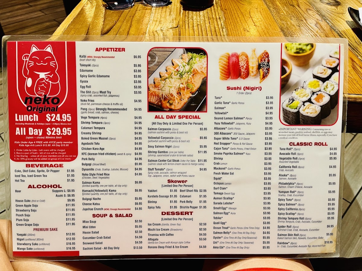 Welcome to Sushi Neko, a vibrant gem nestled in Las Vegas’ bustling Chinatown. Offering a comprehensive all-you-can-eat menu, Sushi Neko caters to every sushi lover’s dreams. The establishment is renowned for its fresh selections, from classic rolls to inventive baked options like the Wet Dream Roll and the Japanese Lasagna Roll.