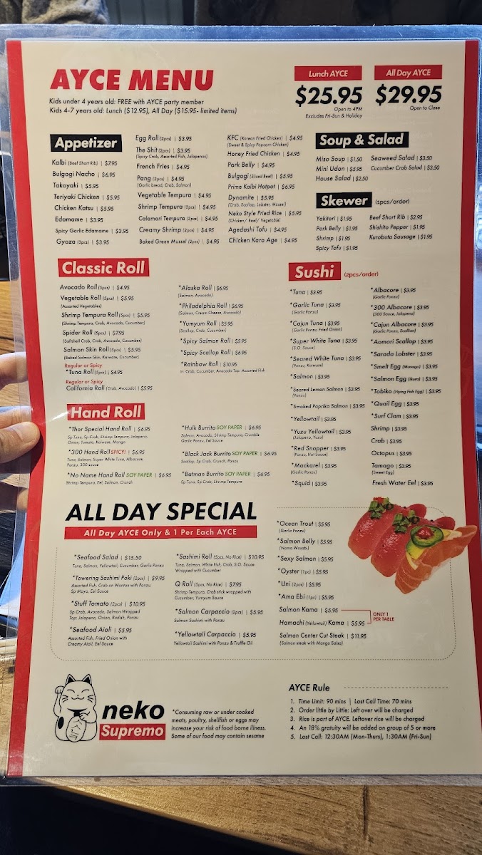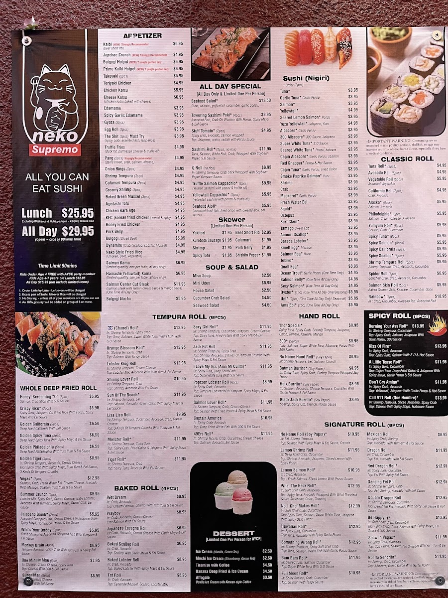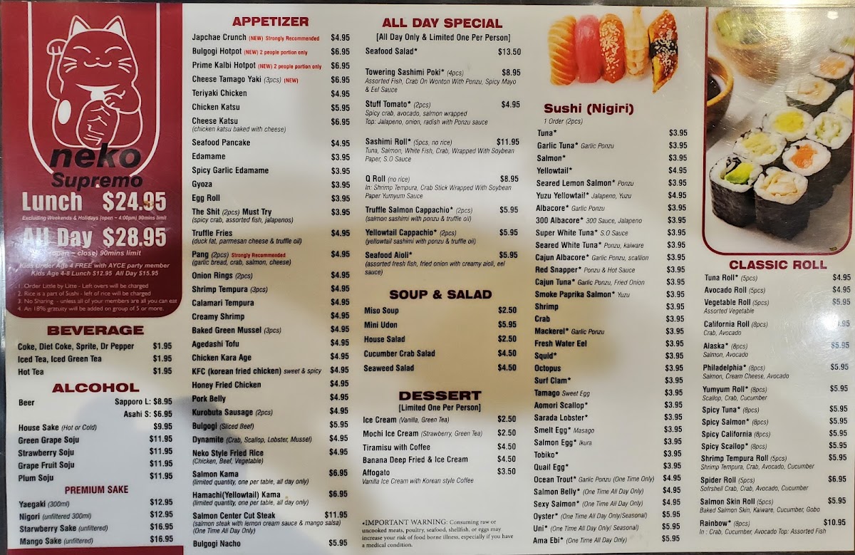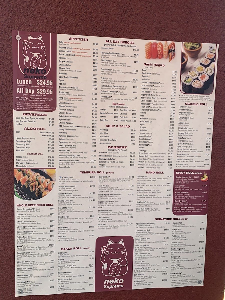 Welcome to Sushi Neko, a vibrant gem nestled in Las Vegas’ bustling Chinatown. Offering a comprehensive all-you-can-eat menu, Sushi Neko caters to every sushi lover’s dreams. The establishment is renowned for its fresh selections, from classic rolls to inventive baked options like the Wet Dream Roll and the Japanese Lasagna Roll.